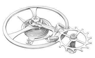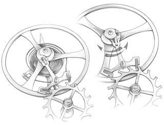 The ticking heart of your watch – and arguably its most vital features – are the escapement and balance wheel. As power flows into the balance wheel, it swings back and forth at a steady rhythm. This rhythm is maintained by the hairspring, which pushes back against the force coming from the mainspring. Without this counter-push, the hands on your watch would just spin around the dial at dizzying speeds as the mainspring unwound itself fully in one go. The weight of the balance wheel gives it momentum, causing it to push against the hairspring. The hairspring is stronger than the mainspring and pushes the balance wheel back. The more power you’ve stored in your mainspring, the further and faster the balance wheel turns. Less power means slower and shorter movement.