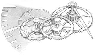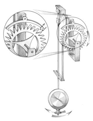 In 1656, Dutch inventor Christiaan Huygens made clocks 60 times more accurate with the invention of the pendulum clock. The revolutionary thing about it was that it introduced the first harmonic oscillator for accuracy. The power source of these clocks was a weight that pulled on the gears and drove the pendulum back and forth. The pendulum was connected to the pallet fork, so each swing let the gears move a specific amount. Since the force of gravity is constant, the force pulling on the weight and the pendulum keeps the clock running consistently. The same principle is at work in the opposing pushes of the mainspring and the hairspring acting upon the balance wheel in modern mechanical watches.