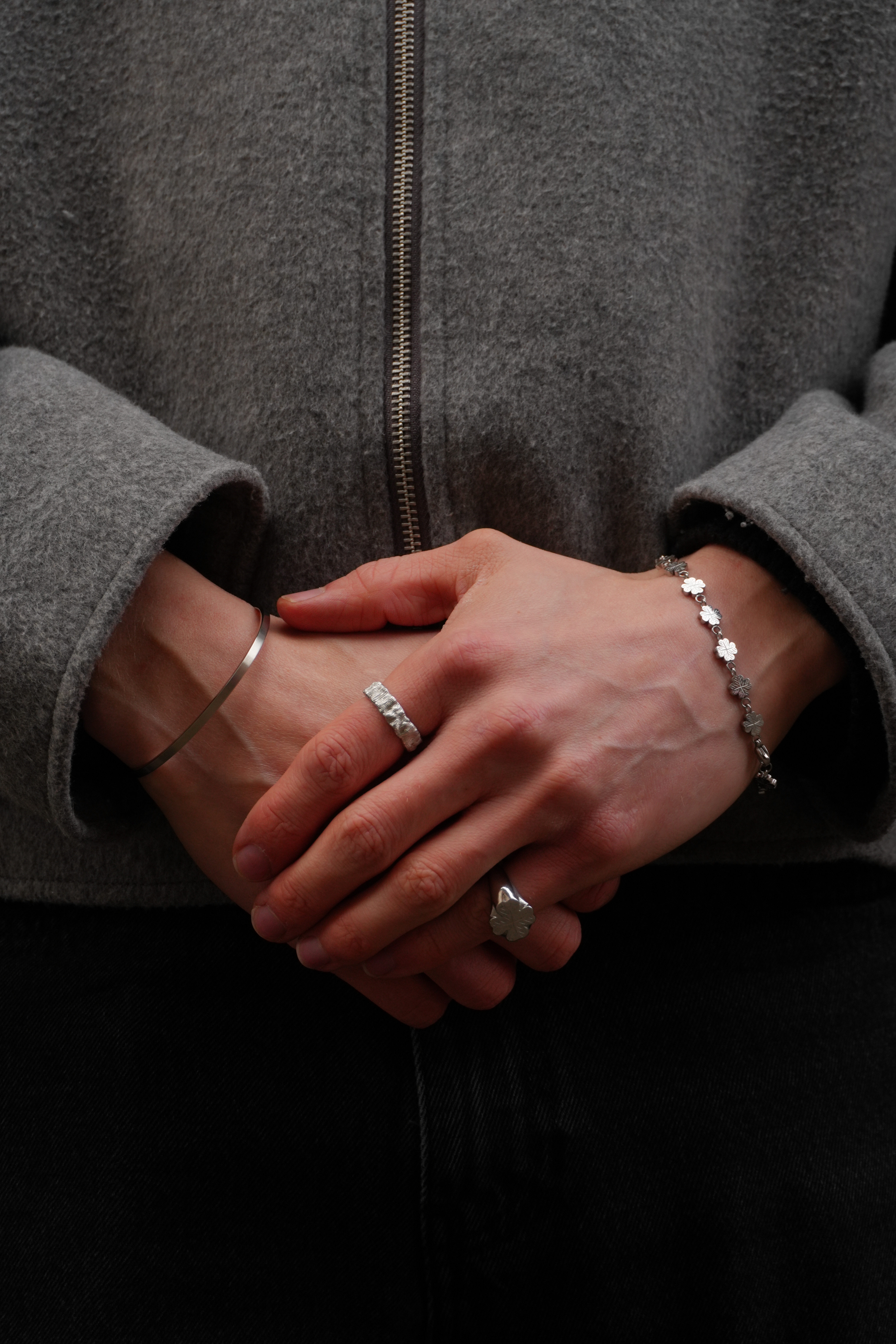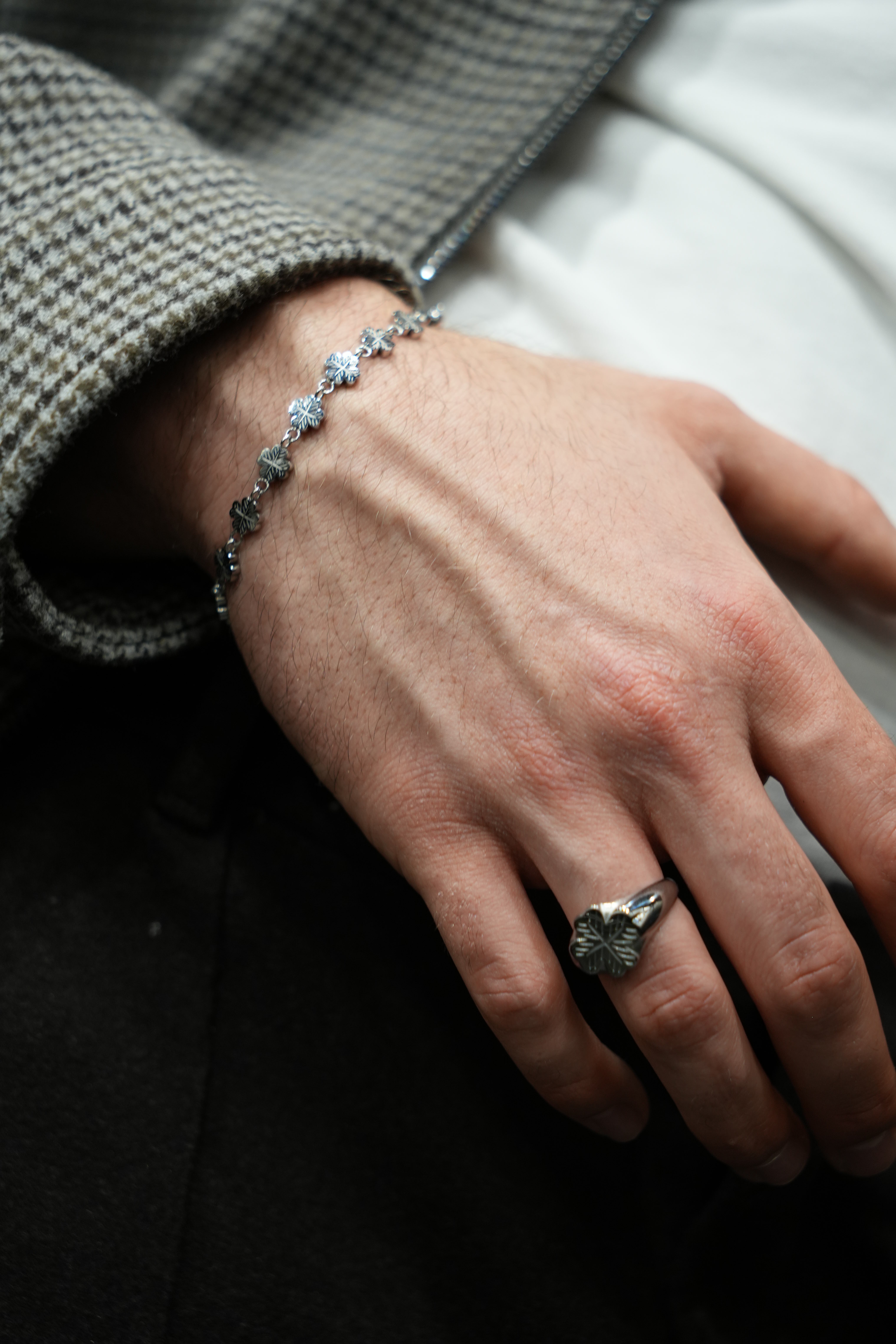 Made from 925 sterling silver with a bright silver finish, this bracelet has a subtle engraved texture on each link. Small four-leaf floral motifs form a low-profile chain that mixes delicate detail with a clean silhouette. The result is a refined, easy-to-wear bracelet with careful finishing on each link.