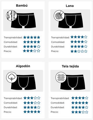El material de la ropa interior afecta mucho a la comodidad, así que mira a ver qué es lo más importante para ti, como la suavidad, transpirabilidad o facilidad de mantenimiento y decide en consecuencia.
