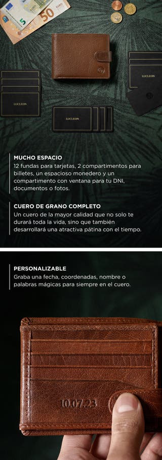 - Con capacidad para hasta 20 tarjetas, monedas y recibos