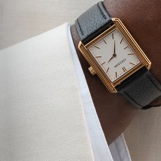 Legacy | Reloj cuadrado retro en tono dorado con esfera crema con números romanos y correa de cuero negra