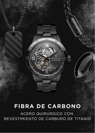 Acero inoxidable de grado quirúrgico y cuero auténtico con detalles de fibra de carbono. El acero está recubierto de carburo de titanio.