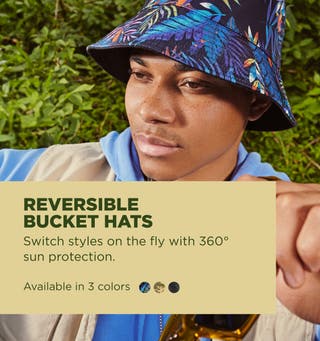 Embrace vacation vibes with this reversible men’s bucket hat. This versatile accessory features a soft cotton black side for a sleek look. The vibrant floral-print side adds a tropical touch – made from 100% polyester for protection against the elements.