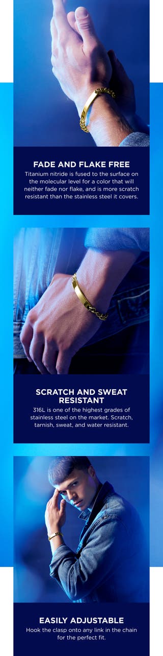 This bracelet pairs 316L stainless steel with a polished gold-tone finish and a flat identification plate for a clean, modern look. The curb-style chain has mirror-polished links for an even shine. Smooth surfaces and neat joins create a low-profile, easy-to-wear shape.